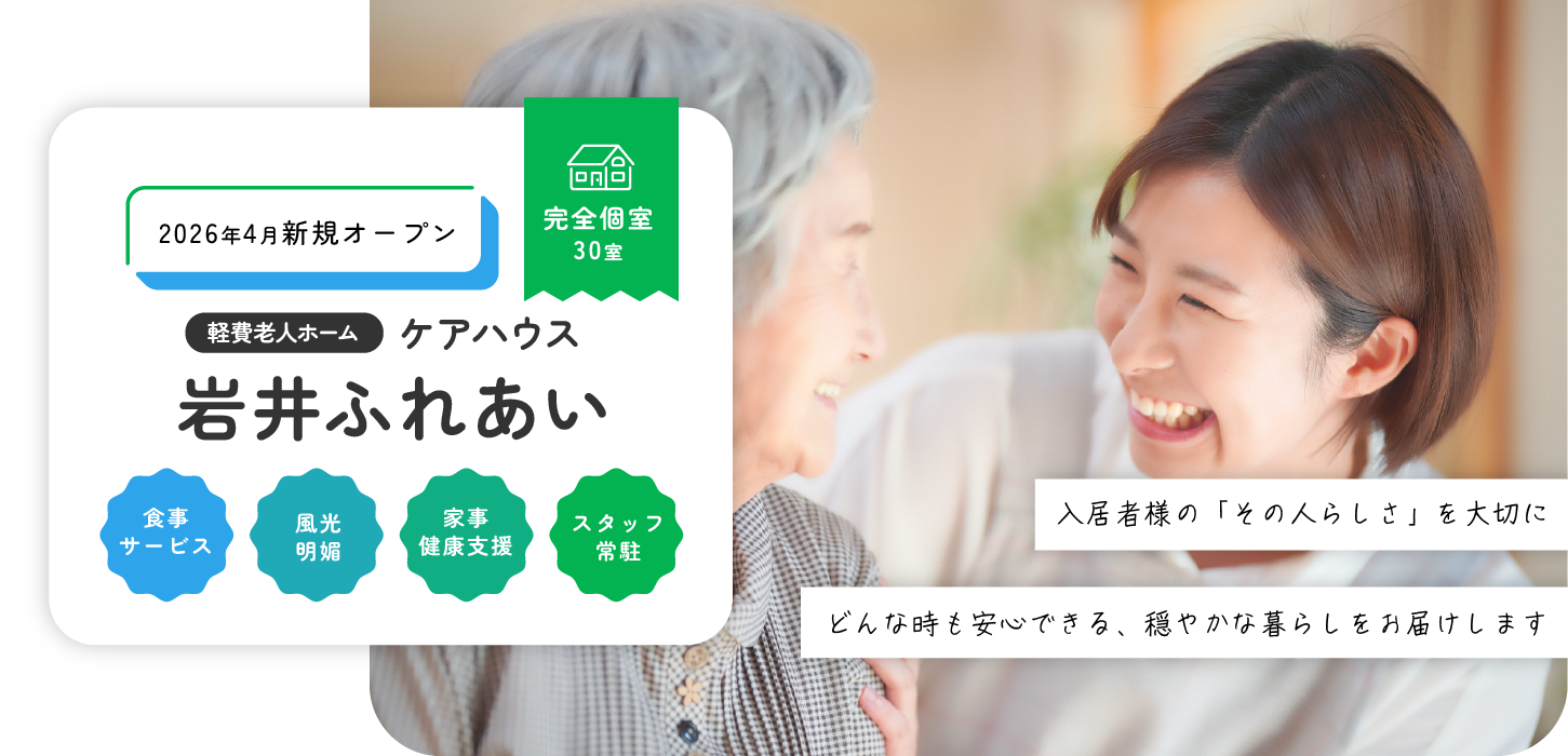ケアハウス 岩井ふれあいは、地域の皆様に支えられながら、家庭の事情などでご家族様と同居が難しい、要支援または要介護の認定を受けている方々に、安心して暮らしていただける住まいを提供する軽費老人ホームです。